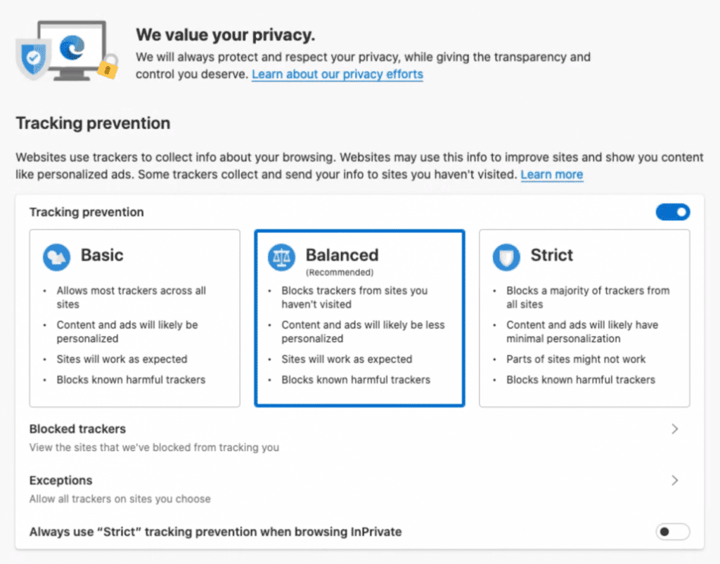 Add: edge://settings/privacy to your address bar and hit enter. You will see below privacy hub.