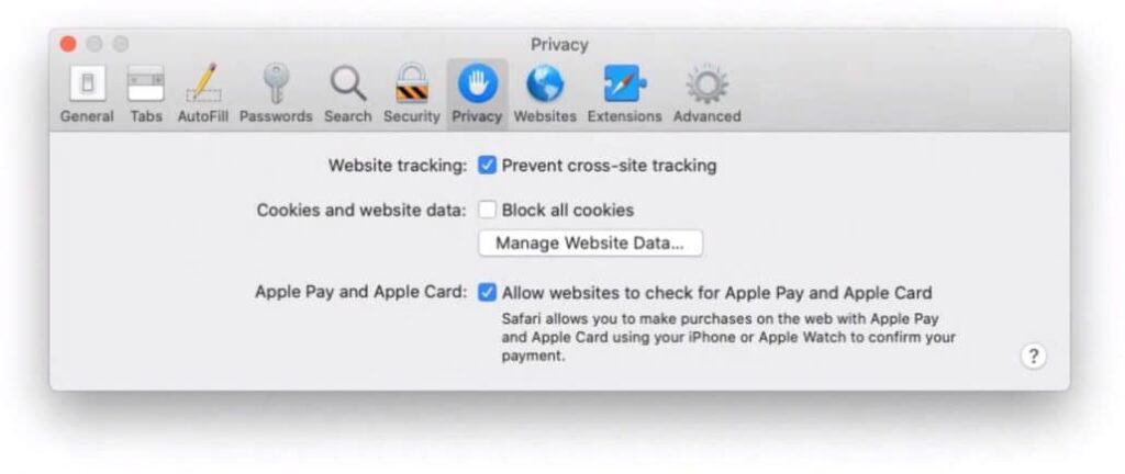 Go to Safari > Preferences > Privacy to find the privacy settings of Safari. Understand that blocking all cookies might break websites. So if something happens, you know where to look.